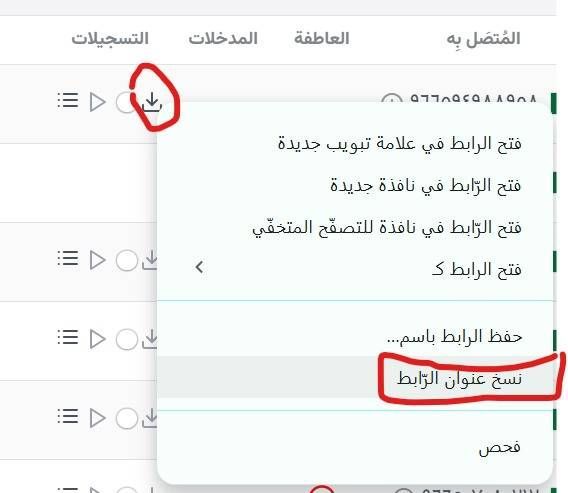 إضغط الزر الأيمن على تحميل المكالمة - ثم نسخ الرابط (الصورة أدناه للتوضيح):